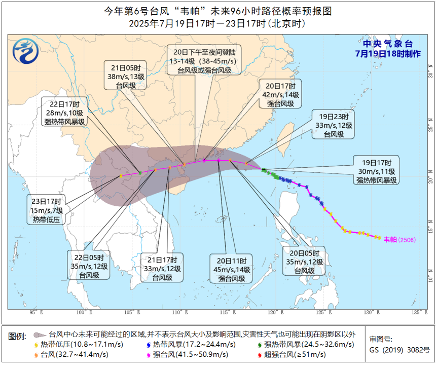 据中央气象台最新预计,“韦帕”将以每小时30公里左右的速度向西偏北方向快速移动,强度继续加强,向广东珠海到海南文昌一带沿海靠近,并将于20日下午至夜间在上述沿海登陆(13~14级,38~45米/秒,台风级或强台风级),以后穿过广东雷州半岛,21日白天移入北部湾海面,随后趋向越南北部沿海。