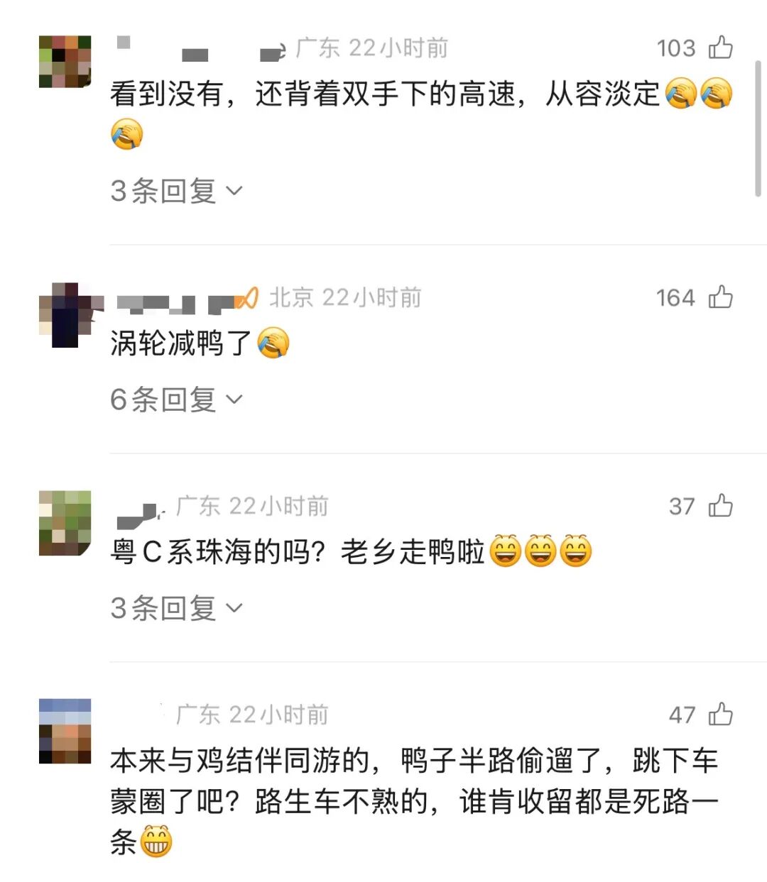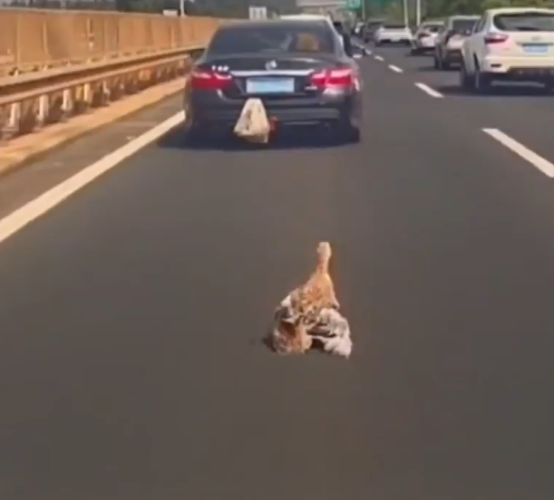 高速路上粤C车主挂在后备箱上的活鸭子掉落,当场逃走,车主:吃的时候记得熬久一点