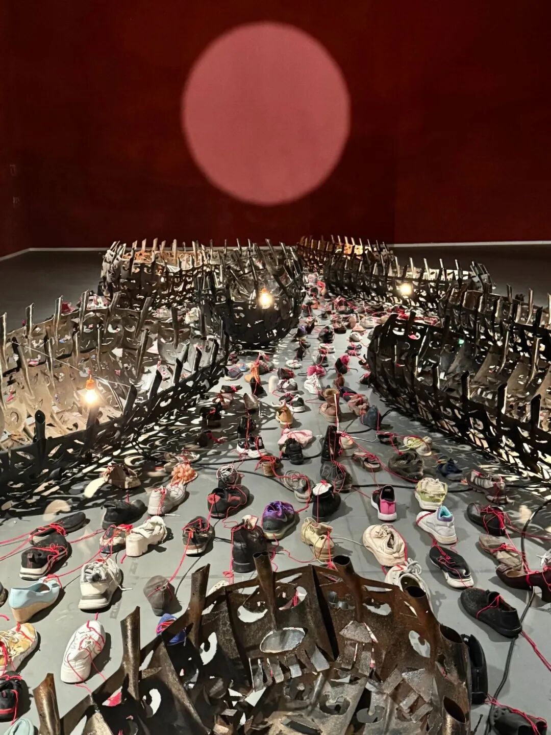 据了解,《远方》是艺术家对“迁徙与生存”这一人类母题的视觉阐释。在创作陈述中,红线串联的鞋则被赋予“生命轨迹的物质化符号”之意,代表血脉相连的精神纽带。艺术家试图通过钢铁、织物与红线等材质的碰撞,构建一幅关于漂泊与归依、个体与文明的精神图景。“希望通过生活中承载记忆的旧物,呈现人类逐水而居、向光而行的集体历程。”相关创作笔记中写道。