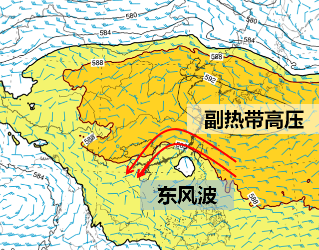 •什么是东风波?副热带高压南侧,盛行强劲的东风气流。在东风气流中会存在一个槽或气旋性弯曲较大区域,随气流如同波浪自东向西移动,所以称为东风波。高空气流容易在东风波处交汇,水汽聚集形成明显降水,降水效率高是东风波降水的特点。据统计,在热带地区,有25%的东风波动可以发展成台风。