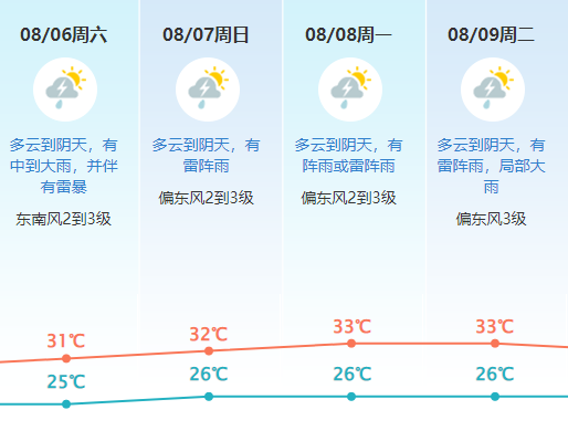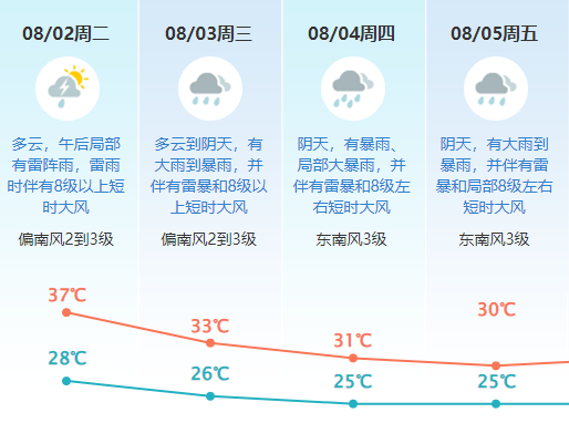 预计我市2日仍高温炎热,午后局部有雷阵雨;3-5日受东风波动影响,将有大雨到暴雨、局地大暴雨,并伴有雷暴和8级以上短时大风、局部冰雹等强对流天气 ,三天过程累计雨量120-180毫米、局部200毫米以上,最大时雨强40-60毫米,高温天气缓解;展望6日起降雨减弱。