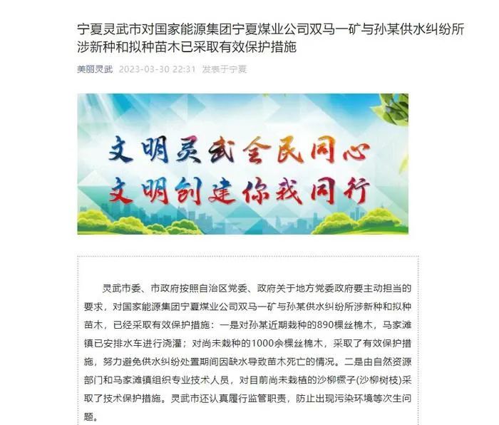 据宁夏“美丽灵武”3月30日消息:灵武市委、市政府按照自治区党委、政府关于地方党委政府要主动担当的要求,对国家能源集团宁夏煤业公司双马一矿与孙某供水纠纷所涉新种和拟种苗木,已经采取有效保护措施: