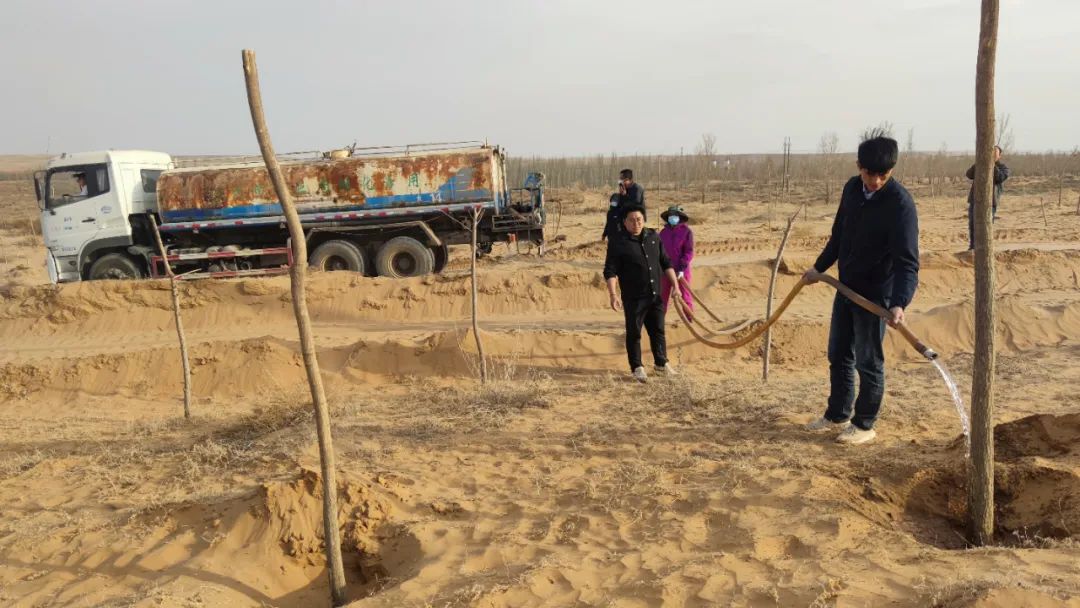 灵武市自然资源局专业技术人员指导苗木保护,马家滩镇工作人员对苗木进行浇灌。