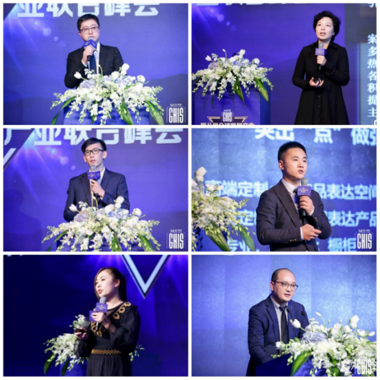 (图为智能电器事业部总经理许晶、进口品类事业部总经理宋晓宁、设计客厅事业部总经理马伟杰、定制品类事业部总经理李占强、软装品类事业部总经理万莉芸、门窗地板事业部总经理王一瑞)