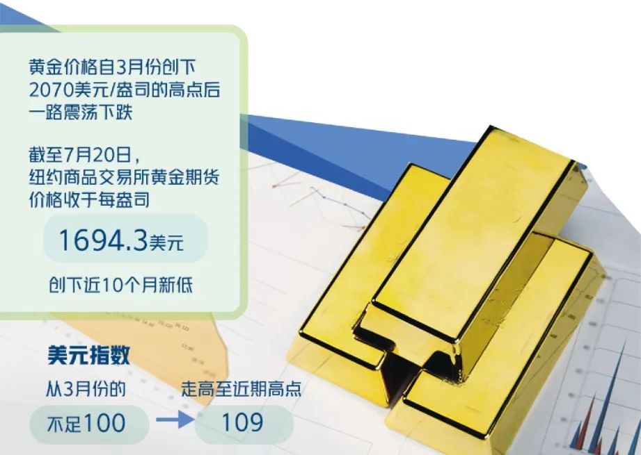 今年以来,受疫情起伏反复、国际地缘政治冲突与美联储货币政策调整等多重因素叠加影响,黄金价格波动明显。自3月份创下2070美元/盎司的高点后,国际金价一路震荡下跌。截至7月20日,纽约商品交易所黄金期货价格收于每盎司1694.3美元,创下近10个月新低。不过,最近几天稍有回升。