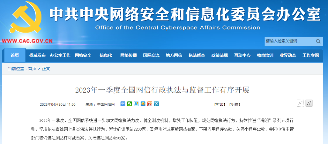 据国家网信办消息,2023年一季度,全国网信系统进一步加大网络执法力度,持续推进“清朗”系列专项行动,依法查处网上各类违法违规行为,累计约谈网站2203家 ,暂停功能或更新网站48家,下架应用程序55款,关停小程序12款,会同电信主管部门取消违法网站许可或备案、关闭违法网站4208家。(此前报道:2203家网站被约谈)