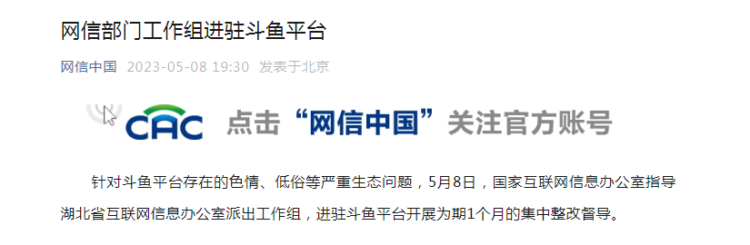 据“网信中国”微信消息,针对斗鱼平台存在的色情、低俗等严重生态问题 ,5月8日,国家互联网信息办公室指导湖北省互联网信息办公室派出工作组,进驻斗鱼平台开展为期1个月的集中整改督导 。