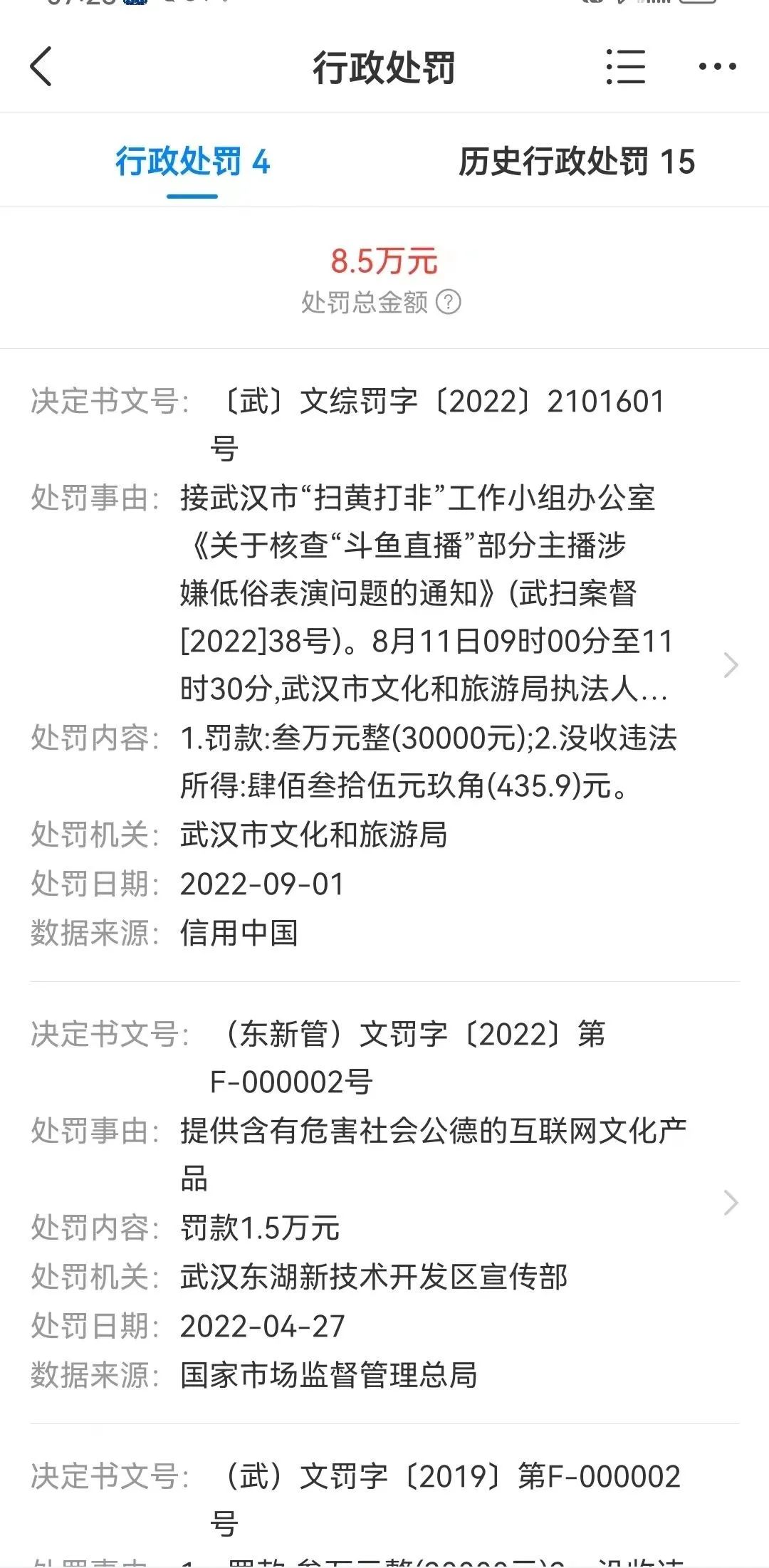 2019年至2022年间,武汉市文化和旅游局等相关部门,曾因表演方式低俗等违规问题,四次对斗鱼作出行政处罚,共计罚款8.5万元 。