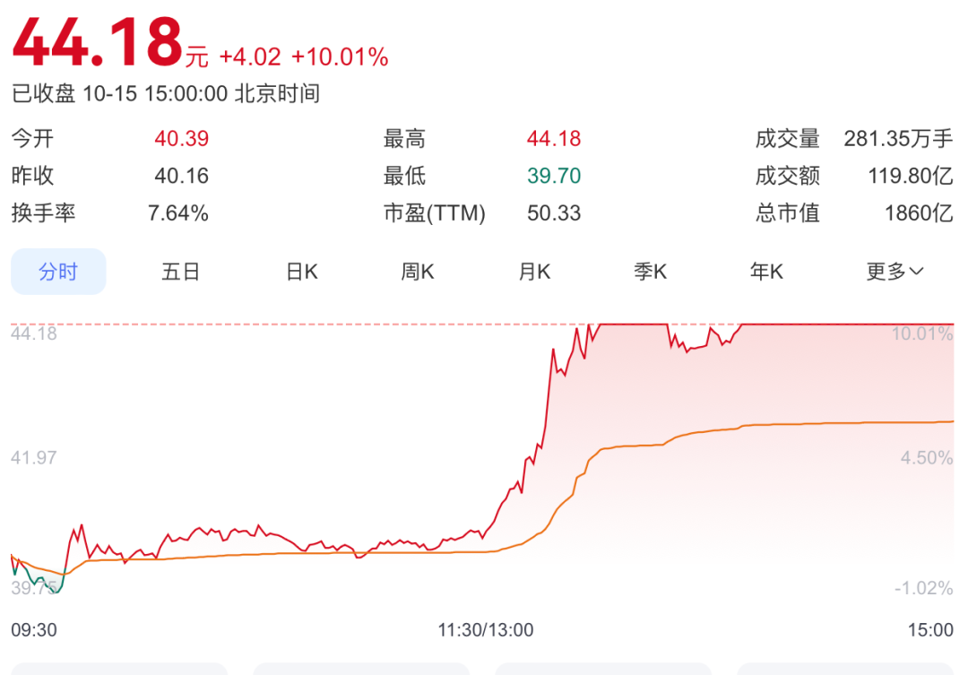 10月15日,三花智控尾盘强势拉升封涨停,截至收盘,该股报44.18元/股,全日成交近120亿元;其港股亦大幅走高,收盘涨约13%。