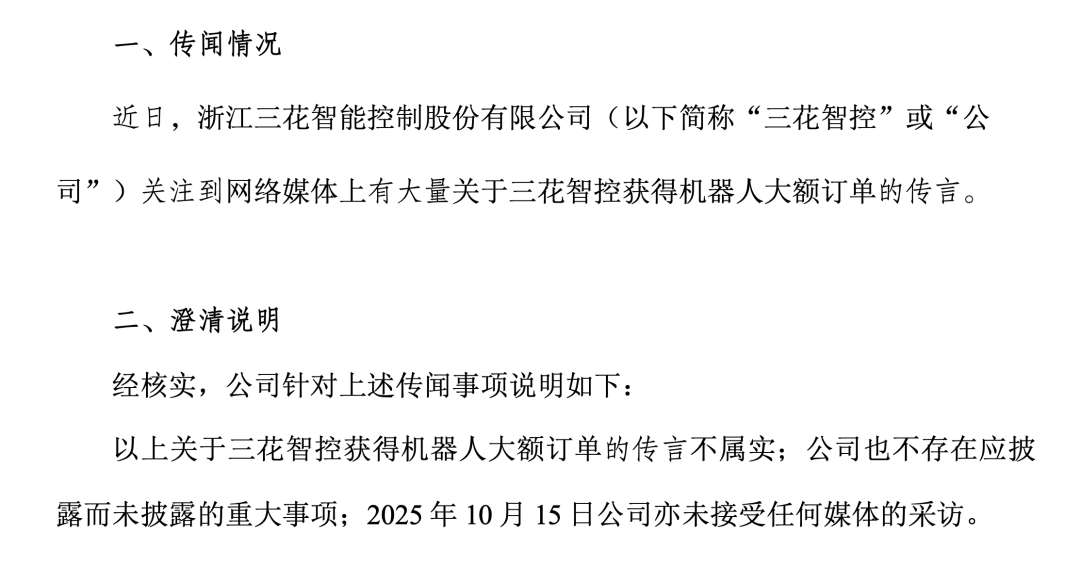 10月15日晚间,三花智控(002050.SZ)公告称,近日关注到网络媒体上有大量关于公司获得机器人大额订单的传言,经核实,该传言不属实;公司也不存在应披露而未披露的重大事项;10月15日公司亦未接受任何媒体的采访。