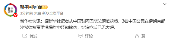 新华社快讯:据新华社记者从中国驻阿巴斯总领馆获悉,3名中国公民在伊朗南部沙希德拉贾伊港爆炸中轻微擦伤,经治疗后已无大碍。