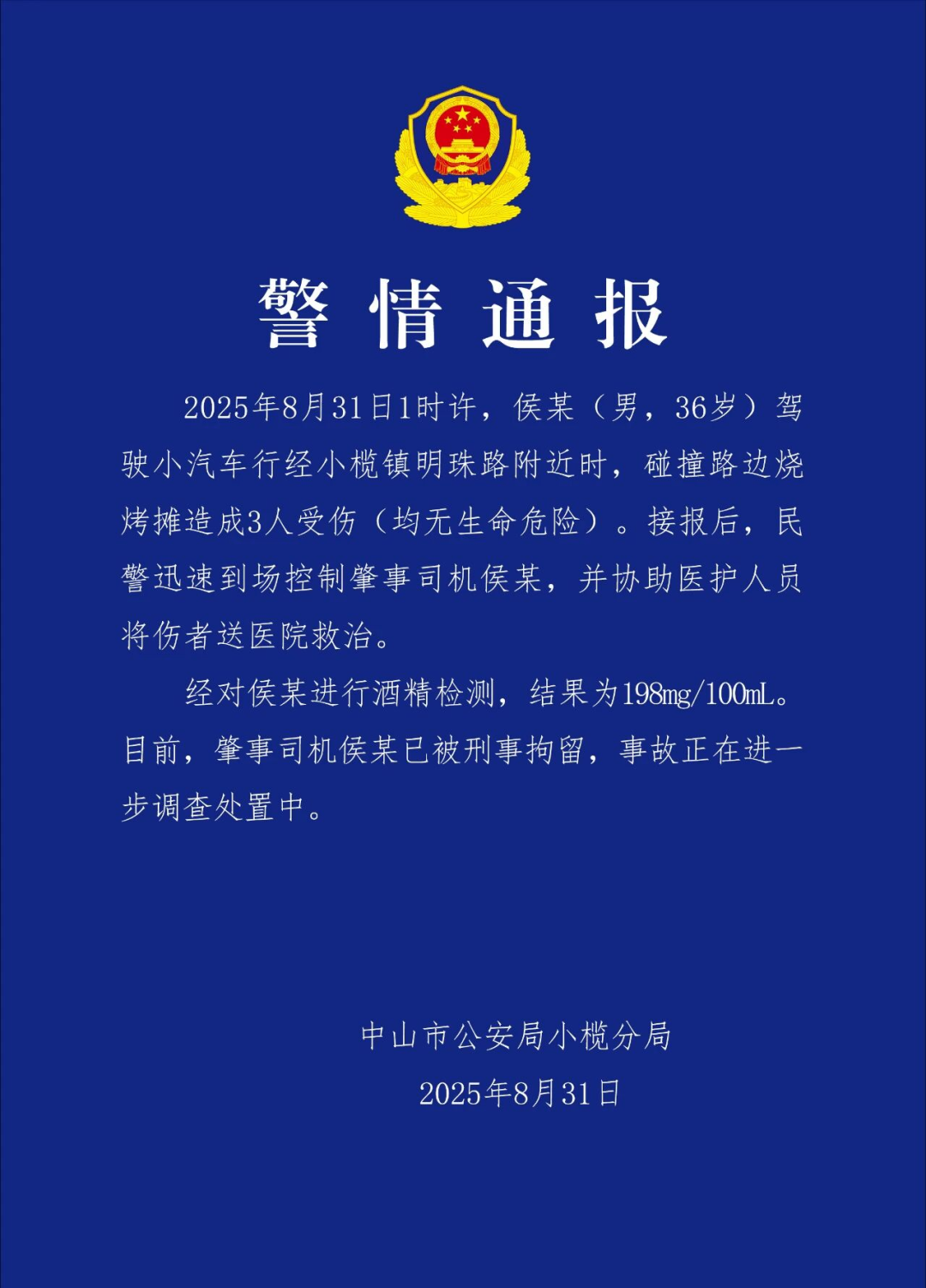 2025年8月31日1时许,侯某(男,36岁)驾驶小汽车行经小榄镇明珠路附近时,碰撞路边烧烤摊造成3人受伤(均无生命危险)。接报后,民警迅速到场控制肇事司机侯某,并协助医护人员将伤者送医院救治。