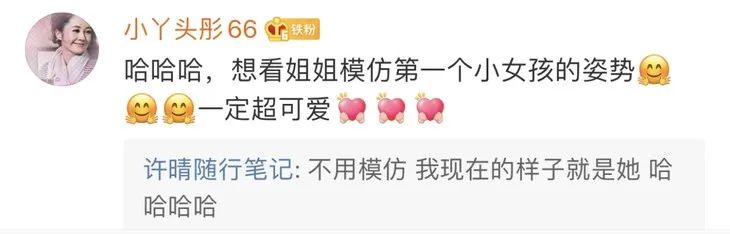 评论里有粉丝说想看许晴模仿第一个小女孩的姿势,许晴则回复道:“不用模仿,我现在的样子就是她。”