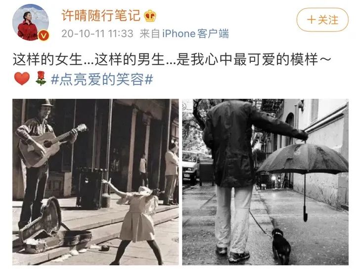 翻看许晴的微博,你会发现,其中既有对生活的纪录,也有对美好的分享。去年10月份,她在微博里分享了两张图片,配文是:“这样的女生,这样的男生,是我心中最可爱的模样~”