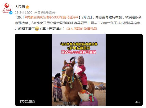 2月2日,内蒙古乌拉特中旗,牧民组织新春那达慕,8岁小女孩勇夺蒙古马5000米赛马亚军!网友:内蒙古孩子从小就骑马这事儿解释不清了。(掌上巴彦淖尔)