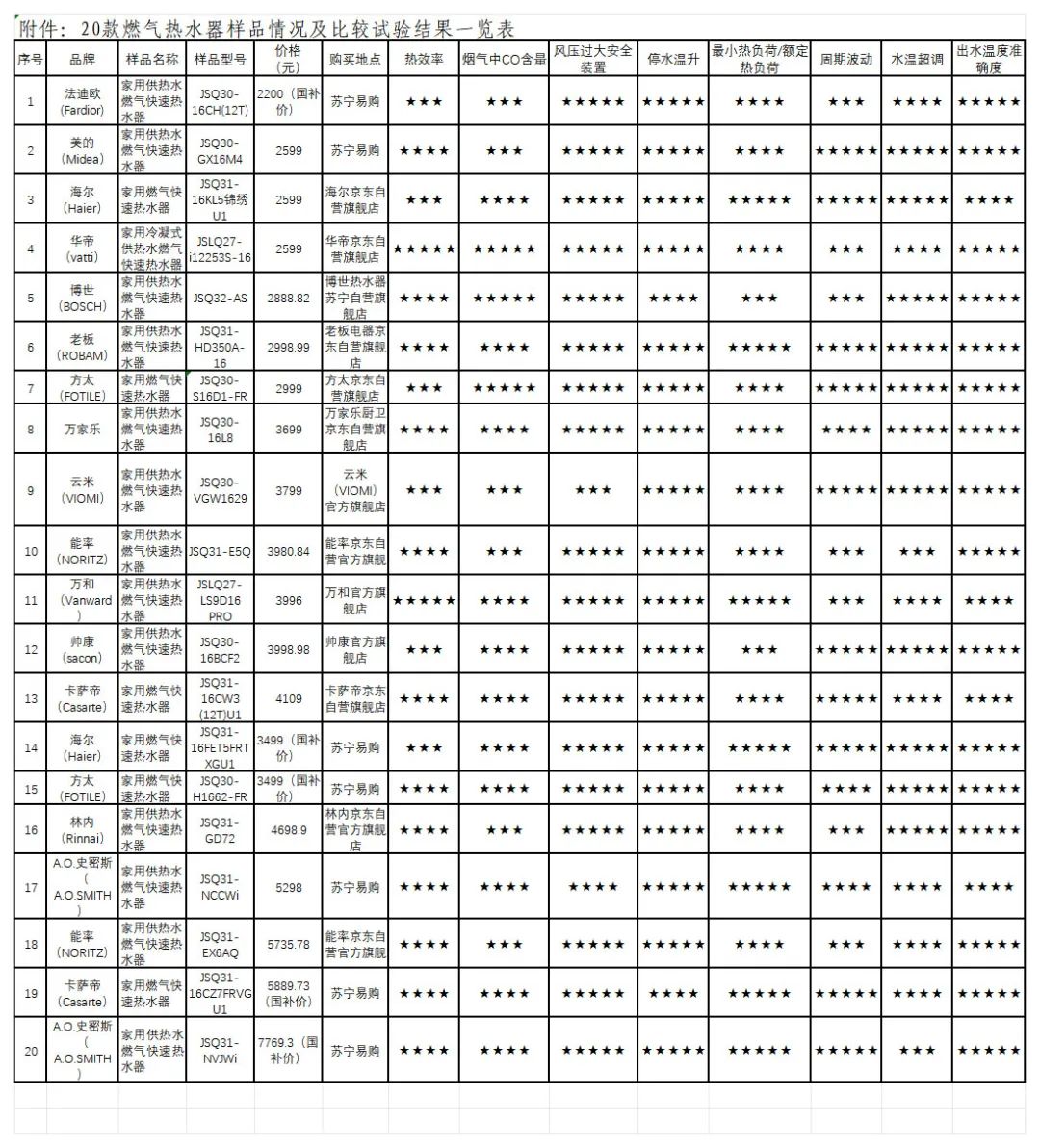综合测试结果,20款燃气热水器样品整体质量较好,在最小热负荷和周期波动测试中存在明显差异,建议消费者根据自身使用情况进行选购。
