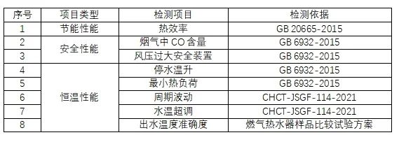 本次比较试验对燃气热水器的热效率、烟气中一氧化碳含量、 风压过大安全装置、停水温升、最小热负荷、周期波动、水温超调、出水温度准确度等方面进行测试。