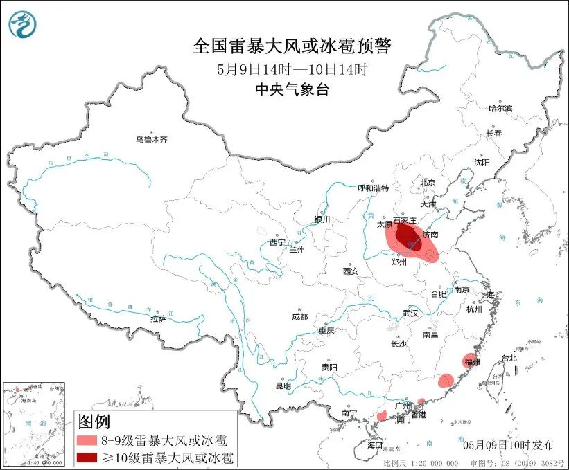 预计5月9日14时至10日14时,华北南部、黄淮北部、华南东部等地的部分地区将有8级以上雷暴大风或冰雹天气 ,其中,河北南部、山东西部、河南北部等地的部分地区将有10级以上雷暴大风,最大风力可达11级以上 ;华北南部、黄淮北部、西南地区东南部、华南西部和南部等地的部分地区将有小时雨量大于20毫米的短时强降水天气,其中,河北南部、河南北部、福建东南部、广东南部、海南岛东北部等地的部分地区小时雨量大于50毫米,最大可达80毫米以上。