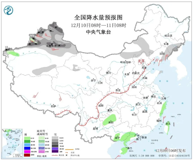 昨天,我国大部雨雪稀少,降水主要出现在新疆、黑龙江、台湾等地。今明两天,新疆降雪还将继续增多增强,局地有暴雪,我国中东部大部仍然维持雨雪稀少的格局。后天起,寒潮将与暖湿气流共同给中东部地区带来大范围雨雪天气。