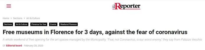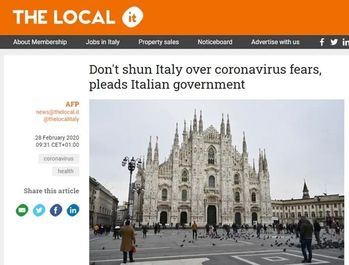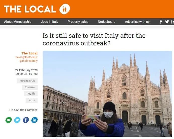 意大利本地的英文媒体theLocal.it最近就连发两篇报道,一篇是引用法新社对于意大利外长的采访,称意大利仍然很安全,呼吁游客们不要取消行程;一篇则是该媒体的一篇原创报道,称人们无需对意大利的疫情恐慌,只要人们做好平时预防流感的措施,那么来意大利旅游就很安全。