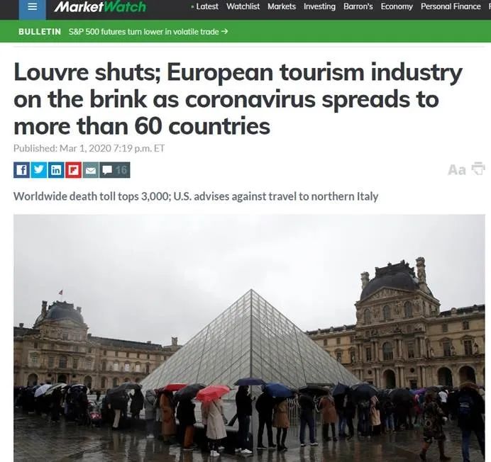 最后,根据美国财经媒体MarketWatch.com的报道,不仅是意大利,法国乃至整个欧洲的旅游业,都在遭受着新冠疫情带来的伤害。
