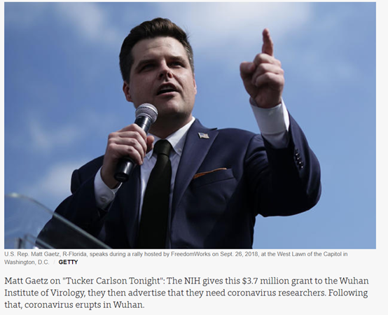 在“60分钟”报道的最后,该栏目又描述了一番颇为魔幻的场景:在特朗普当局这种政治严重干扰科学的环境下,因为与武汉病毒所的项目被停止拨款的Peter Daszak研究团队,不仅无法再为对抗新冠病毒这个美国乃至全世界真正的“敌人”而出力,还不得不裁员。与此同时,像Matt Gaetz这种栽赃武汉病毒所,炒作阴谋论的共和党政客,还在继续着他们的表演……