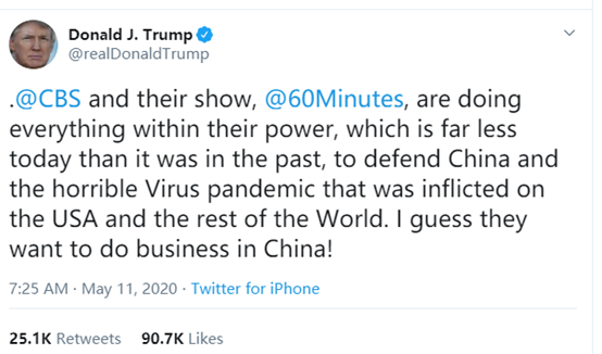 “CBS和他们的节目‘60分钟’,正在竭尽他们的全力….为中国和那让美国以及全世界都深受伤害的可怕病毒辩护。他们或许是想和中国做生意吧?”,特朗普写道。