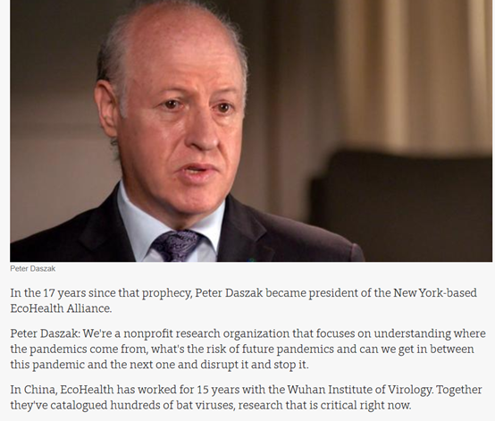 “60分钟”栏目在节目中首先采访了美国“生态健康联盟”(EcoHealth Alliance)的主席Peter Daszak。根据“60分钟”的介绍,他的机构与武汉病毒所有着长达15年的合作关系,而且他们对于蝙蝠等野生动物所携带的各种病毒的研究,对于目前人类抗击新冠病毒疫情更有着十分关键的意义。