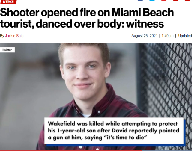 韦克菲尔德的家人告诉《迈阿密先驱报》,当时他正在那里度假,事件发生时他正试图保护他1岁的儿子,然后遭到多次枪击。