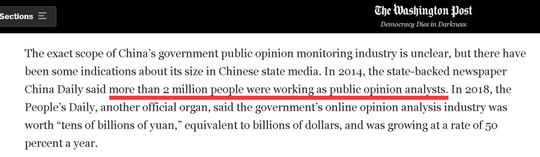 不仅如此,如下图所示,当时《新京报》在报道里还阐明了两个相当重要的信息:1、这200万网络舆情分析师既有为党政宣传部门工作的、也有为门户网站或商业公司工作的,而不是《华盛顿邮报》所渲染的都在给中国政府工作;2、那些给政府工作的网络舆情分析师,要做的“不是删帖”,而是考察和反映网络民意,以助力政府科学决策。