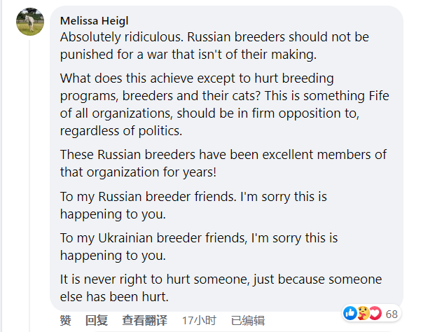在声明下最高赞的一条评论就认为,FIFe对俄罗斯饲养者发出的“制裁”并不合理,除了伤害那些无法左右政局的普通人,对乌克兰当前的局势没有半点帮助。“我们不应该以有人被伤害为理由,去伤害另外一群人”,这条评论写道。