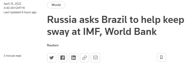 路透社4月15日报道称,据该社看到的一封信显示,俄罗斯请求巴西在国际货币基金组织(IMF)、世界银行(WB)和20国集团(G20)等国际组织当中给予支持,以帮助其对抗西方国家对俄罗斯实施的制裁。
