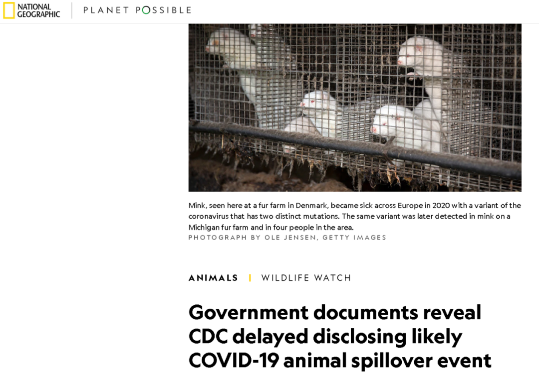 从“国家地理”网站通过法律途径获得的一组美国疾控中心的文件资料来看,美国密歇根州的一个水貂农场曾在2020年10月8日向美国疾控中心发出求救,因为当时该农场出现了感染新冠病毒的水貂把病毒传染给人类的案例。