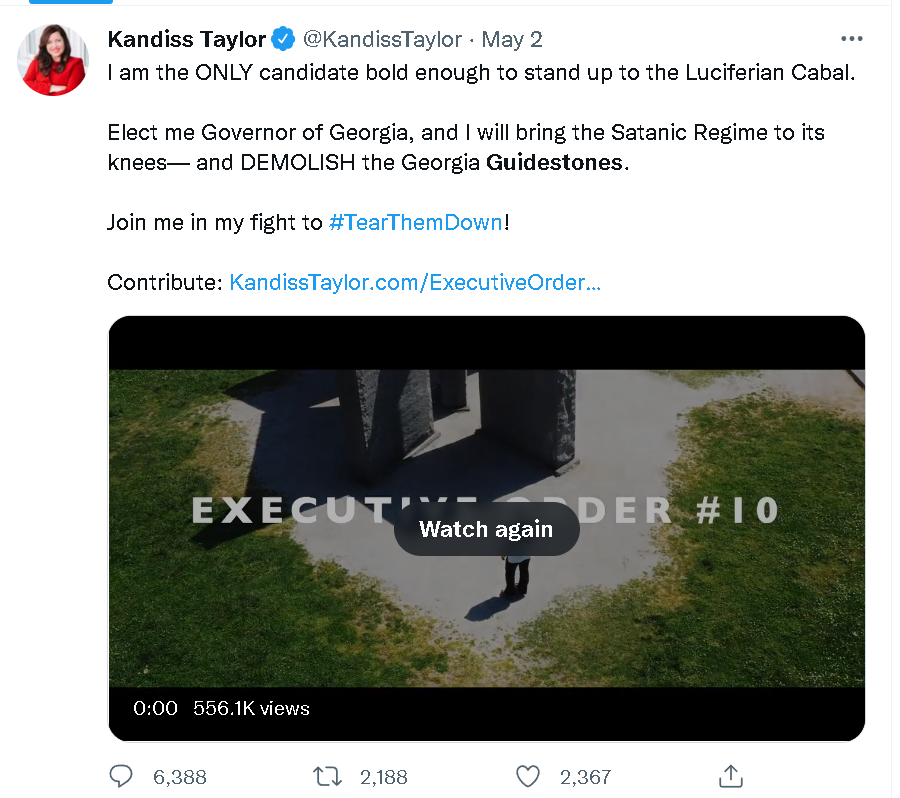 然而,自2016年特朗普成为美国总统以来,被他的成功所刺激到的美国共和党政客便也开始复制起了特朗普迎合美国民粹主义和宗教保守势力的竞选模式。于是,正在参选佐治亚州州长的当地共和党政客坎迪斯·泰勒(Kandiss Taylor),就多次咒骂甚至威胁要拆除这个“魔鬼的指引石”。