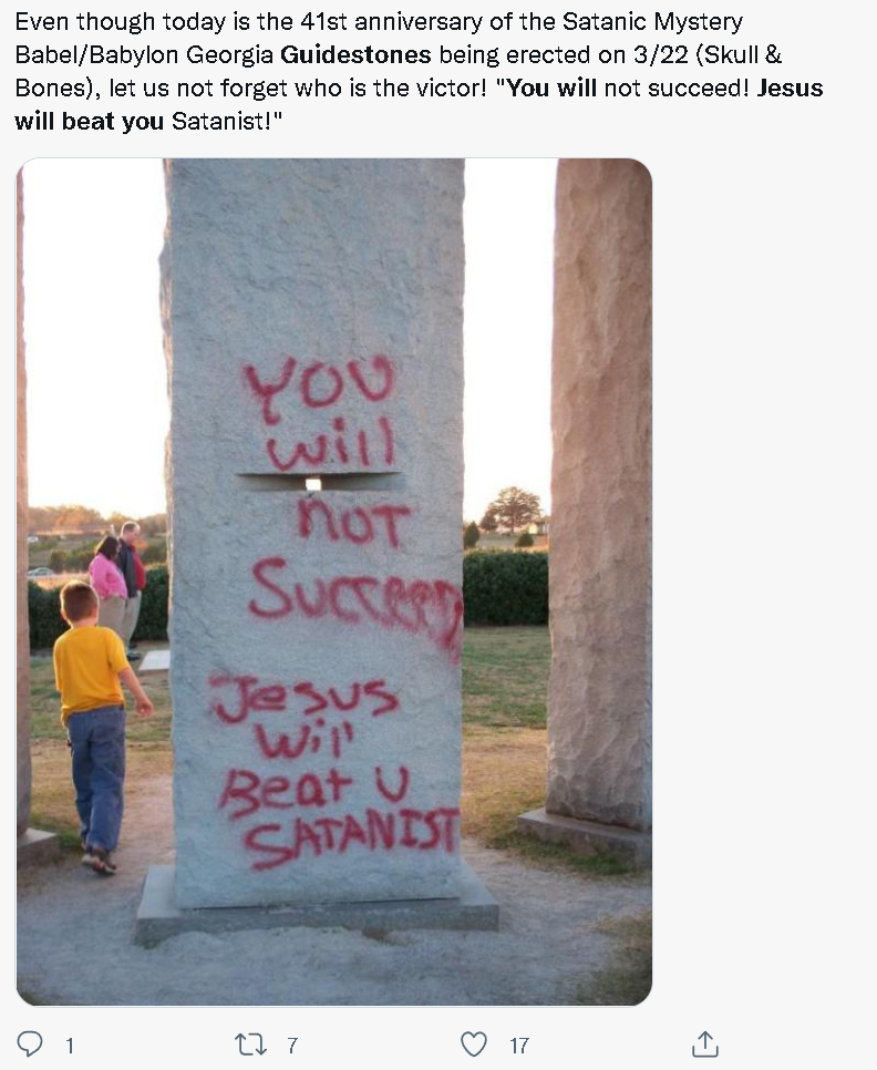 而在当地时间7月6日凌晨这个巨型石碑阵遭到不明身份的人用炸弹破坏后,泰勒更在自己的社交账号上兴奋地表示:是上帝摧毁了这个“魔鬼指引石”。