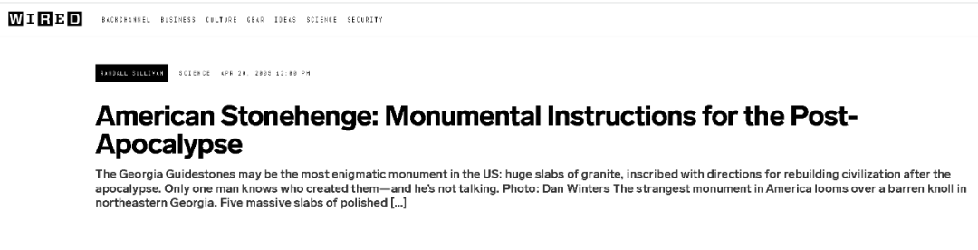 从美国媒体的报道来看,被“强拆”的这座巨型石碑阵名叫“佐治亚指引石”(Georgia Guidestones),是一个身份不明的男子花大价钱请当地一家花岗岩雕刻公司在1980年3月22日竖立起来的,石碑上还有地理方向的指示、一个日冕设计和指向北极星的标记等等。