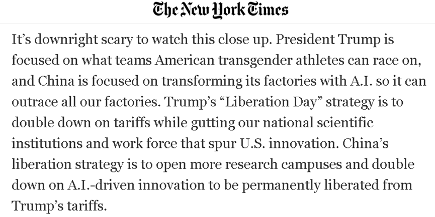 比如,在称赞了中国科技企业华为在美国的打压下仍能不断推进创新、与美国最先进的同类科技企业保持竞争后,弗里德曼就在他的文章中吐槽说,当(美国)“更关注美国的跨性别运动员能参加什么比赛项目时,中国却在聚焦于让人工智能转型其工厂,从而超越我们的工厂”。