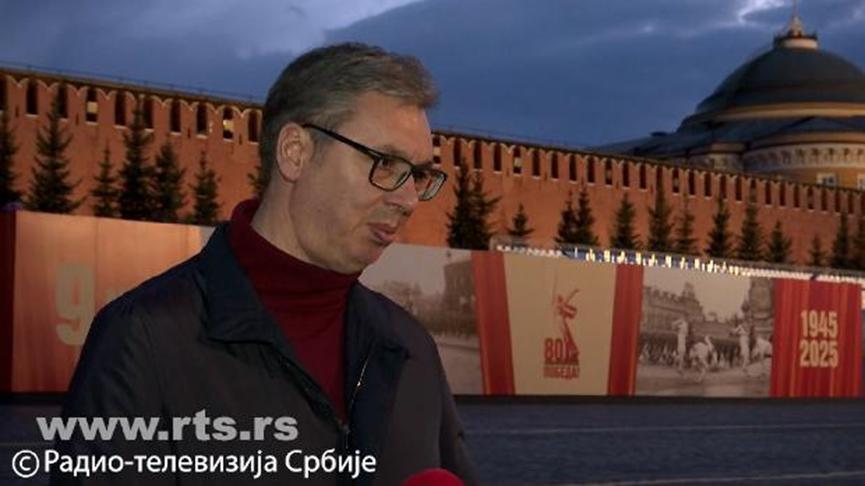 武契奇5月7日在莫斯科红场接受塞尔维亚广播电视台采访 图源:采访视频截图