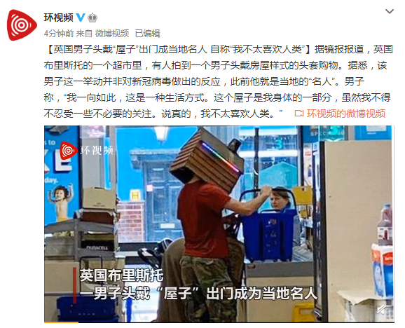 据镜报报道,英国布里斯托的一个超市里,有人拍到一个男子头戴房屋样式的头套购物。据悉,该男子这一举动并非对新冠病毒做出的反应,此前他就是当地的“名人”。男子称,“我一向如此,这是一种生活方式。这个屋子是我身体的一部分,虽然我不得不忍受一些不必要的关注。说真的,我不太喜欢人类。”