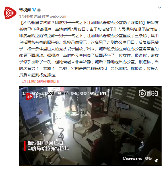 据印度新德里电视台报道,当地时间7月12日,由于加油站工作人员拒绝给瓶里装汽油,印度马哈拉施特拉邦一男子一气之下,往加油站老板办公室里放了三条蛇,其中包括两条有毒的眼镜蛇。监控录像显示,这名男子走到办公室门口,反复摇晃袋子,将一条体型巨大的蛇从袋子里放了出来。随后这条蛇立刻在办公室角落里的家具下面滑动。据报道,当时办公室内桌子后面还坐了一位女性。报道称,该女子似乎被吓了一跳,但她看起来非常冷静,随后平静地走出办公室。报道称,当时这名男子一共放了三条蛇,分别是两条眼镜蛇和一条水南蛇。据报道,救援人员后来赶到将蛇抓走。