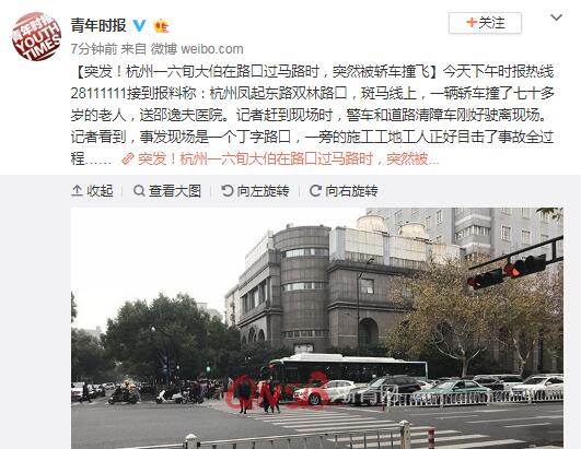 突发!杭州一六旬大伯在路口过马路时,突然被轿车撞飞