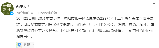 10月21日8时20分左右,位于沈阳市和平区太原南街222号(王二牛烤骨头店)发生爆炸,周边多家商铺和居民楼受影响,事件发生后,和平区公安、消防、应急、城建、属地新华街道办事处及燃气供电供水等相关部门已赶到现场应急处置。目前事件原因正在调查当中。