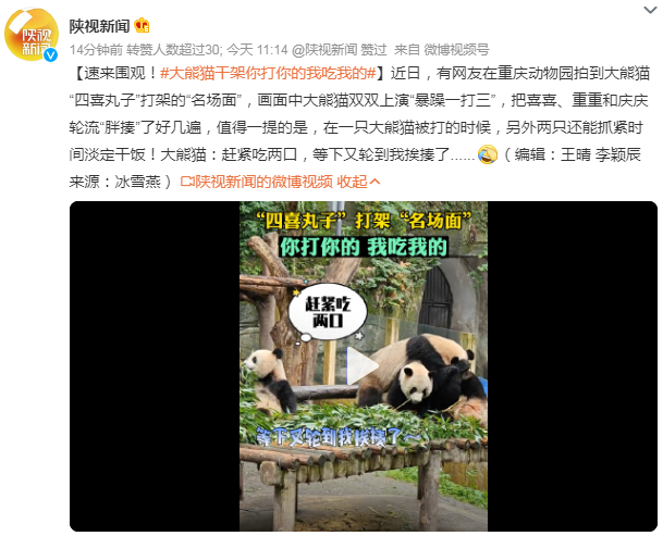 近日,有网友在重庆动物园拍到大熊猫“四喜丸子”打架的“名场面”,画面中大熊猫双双上演“暴躁一打三”,把喜喜、重重和庆庆轮流“胖揍”了好几遍,值得一提的是,在一只大熊猫被打的时候,另外两只还能抓紧时间淡定干饭!大熊猫:赶紧吃两口,等下又轮到我挨揍了......