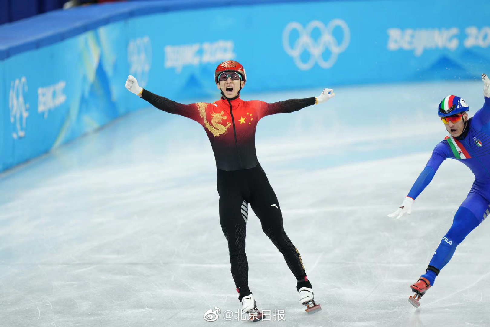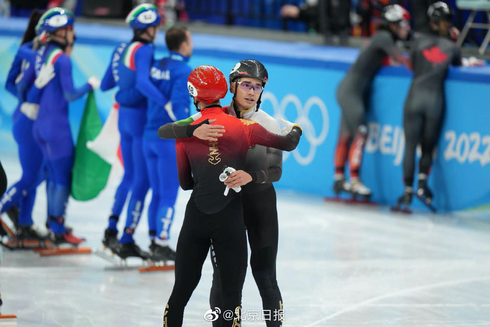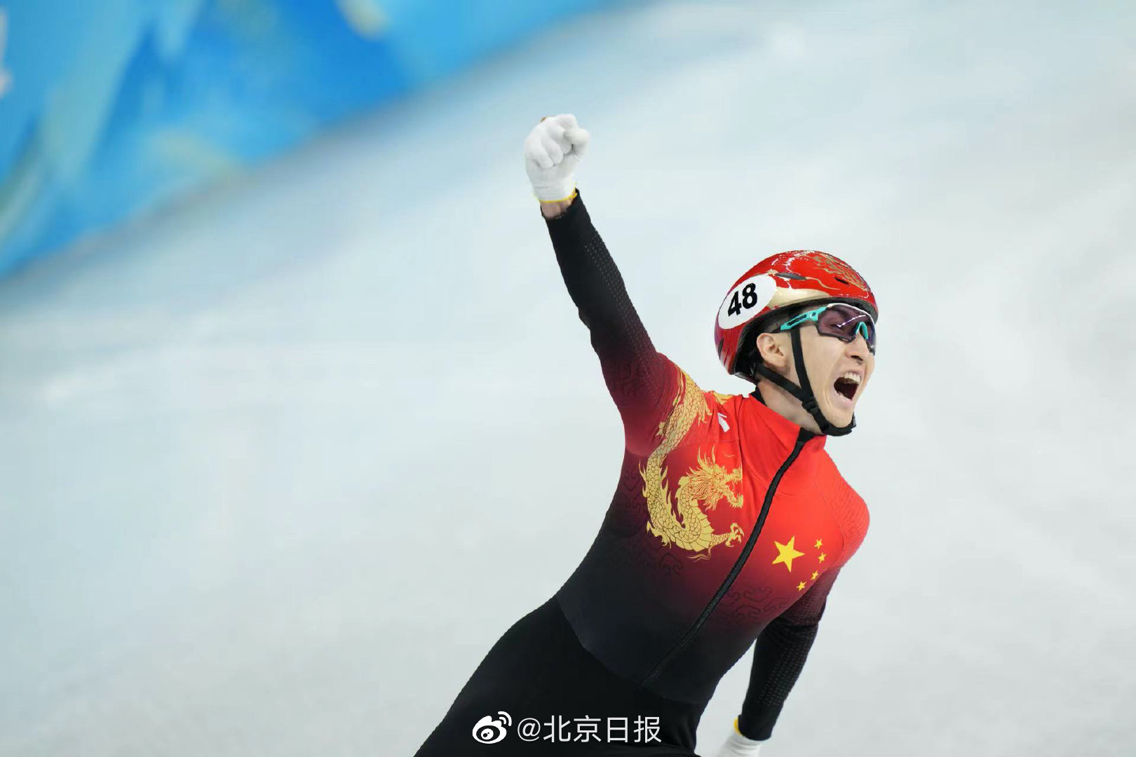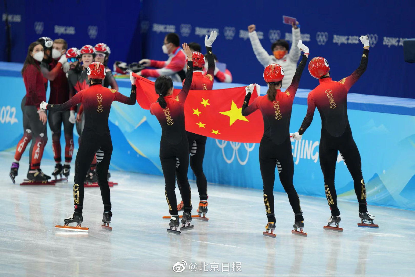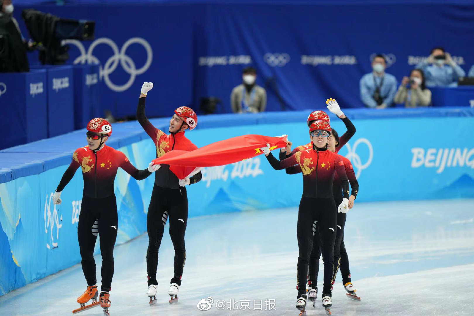 【#中国短道速滑队举国旗绕场感谢#】刚刚,北京冬奥会短道速滑项目刚刚产生首枚金牌。在2000米混合团体接力A组决赛中,由范可新、曲春雨、武大靖、任子威组成的中国队夺得冠军。