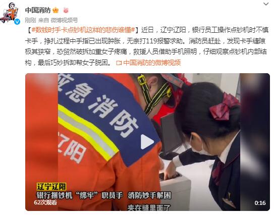 银行员工手卡点钞机 消防员巧妙拆卸帮脱困