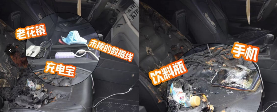 ▲浙江一车主遗留在副驾驶座椅上的手机,因长时间暴晒发生了爆炸,且车内还存在饮料瓶、充电宝、老花镜等多种潜在“定时炸弹”。
