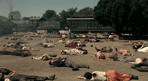 最后,接下来这些同时出现的人物的时间线似乎都紧接着大屠杀发生,但并非同一时间点。比如,两位高管Bernard 和 Charlotte的时间线,苦命鸳鸯Dolores和Teddy的时间线,黑衣人的时间线和剧情总监Sizemore、老鸨Maeve的时间线。