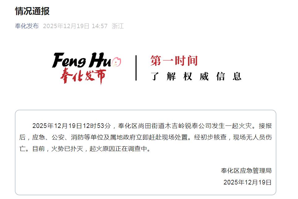 2025年12月19日12时53分,奉化区尚田街道木吉岭锐泰公司发生一起火灾。接报后,应急、公安、消防等单位及属地政府立即赶赴现场处置。经初步核查,现场无人员伤亡。目前,火势已扑灭,起火原因正在调查中。