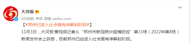11月3日,大河报·豫视频记者从“郑州市新冠肺炎疫情防控”第33场(2022年第8场)新闻发布会上获悉,目前郑州已经进入社会面有序解封阶段。