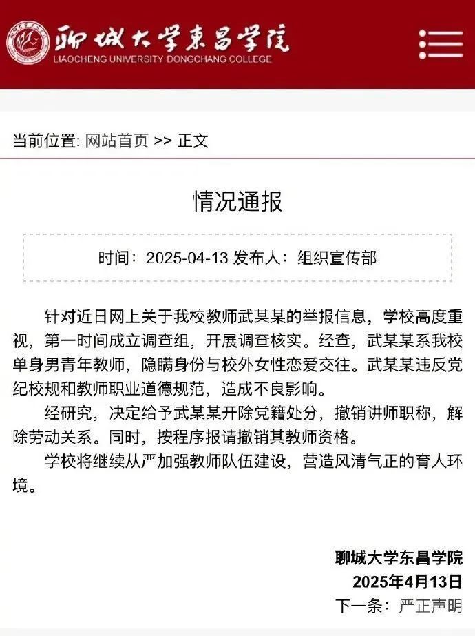 近日,聊城大学东昌学院经济系一教师被举报使用假身份,8年来与多名女学生恋爱、发生关系。13日深夜,聊城大学东昌学院官网发布情况通报: